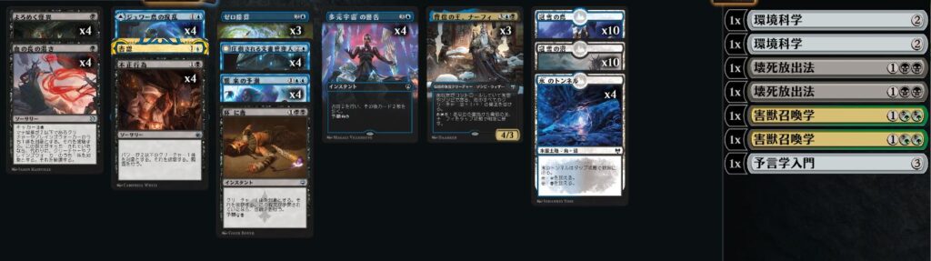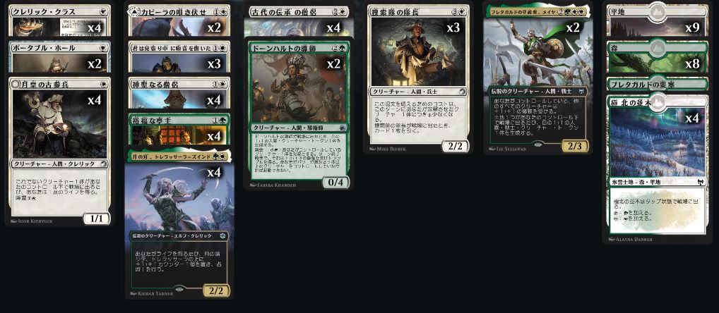 白緑の一強かなぁと思いつつも、対抗も考えてみました。単除去祭りにしたけど、クレリック・クラスがキツイという課題はうまく解決できず。ただ、そこそこ完封できるし、同型もナーフィが隙が少ないフィニッシャーなので割りと好き。